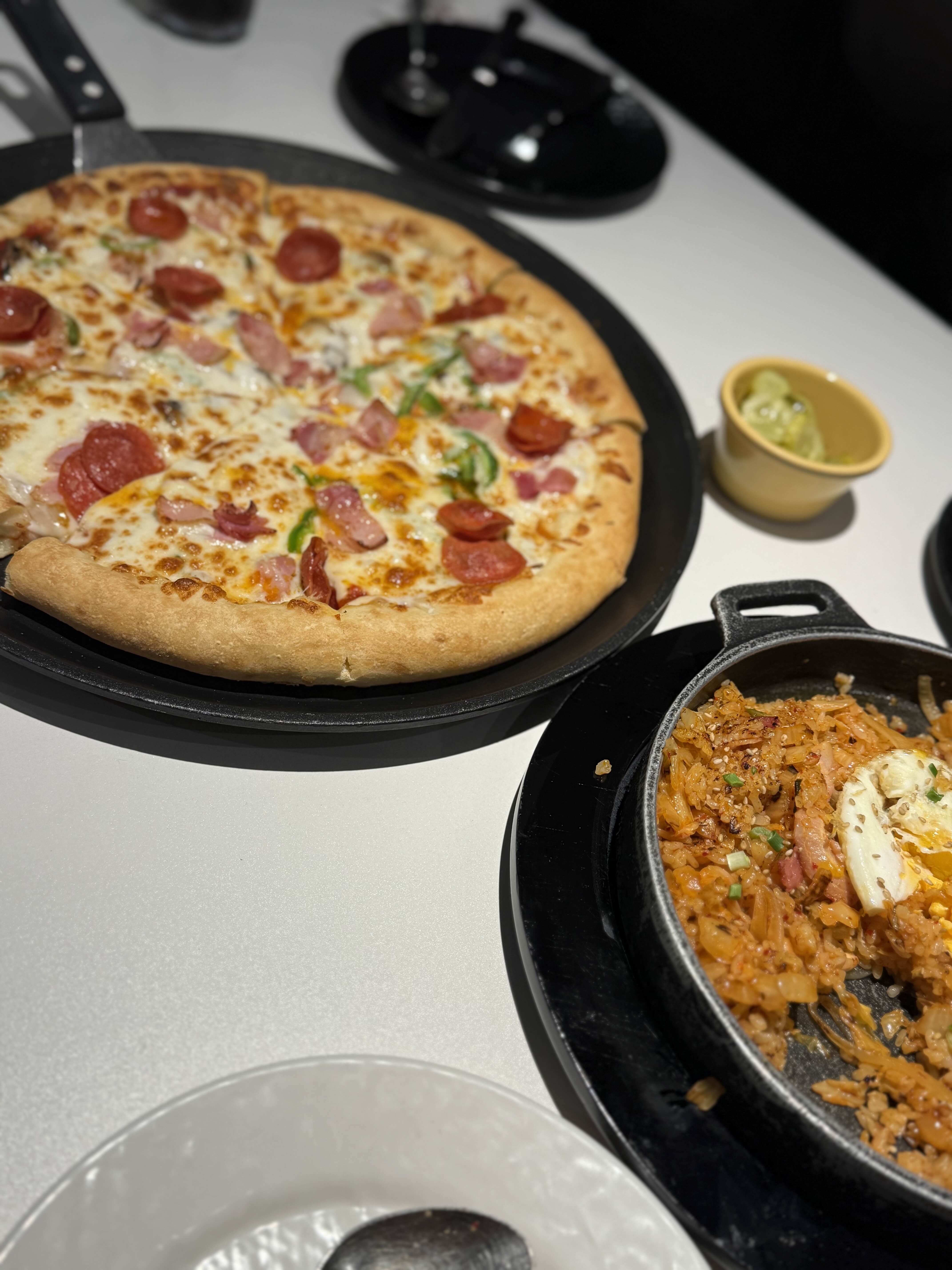 잘 먹는 일행과 함께라 그런지 피자가 나오면 같이 찍고 싶었는데 이미 김치볶음밥이 많이 남지 않았습니다